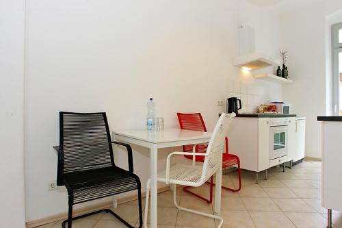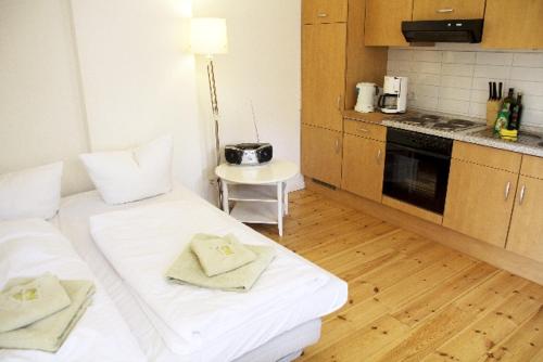 Dieses geschmackvoll eingerichtete Apartment im 3 OG umfasst einen großen Wohn/Essbereich , 1 Schlafzimmer mit französischem Bett,1 Arbeitszimmer mit Schlafmöglichkeit, voll ausgestattete Küche mit Herd und Backofen, 1 Bad mit Badewanne sowie einen 9m² großen Balkon mit Strandkorb und Sitzmöglichkeiten.